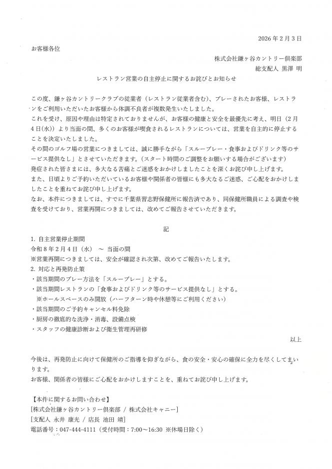 【重要】当クラブレストラン営業の自主停止に関するお詫びとお知らせ(R8.2.3)